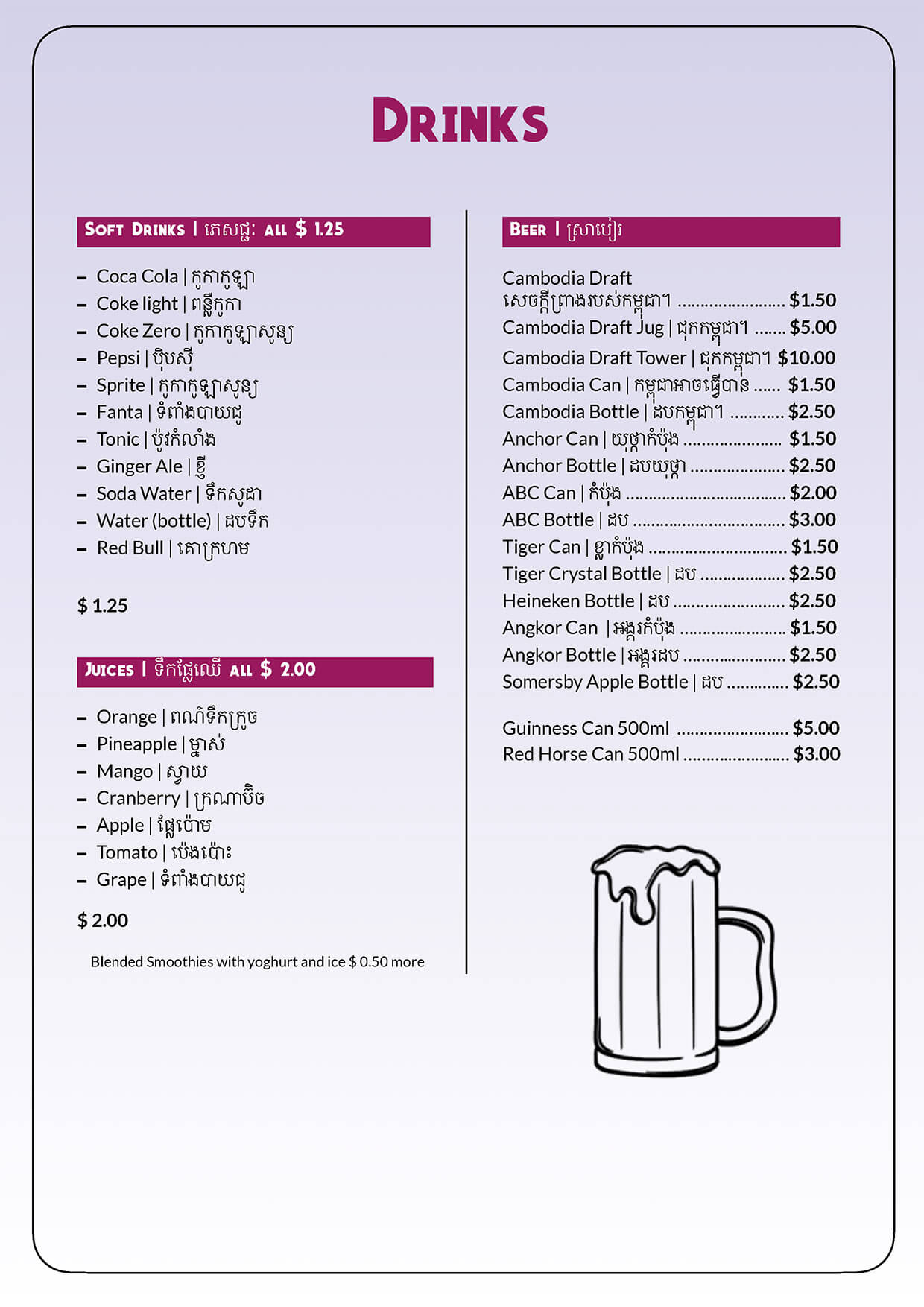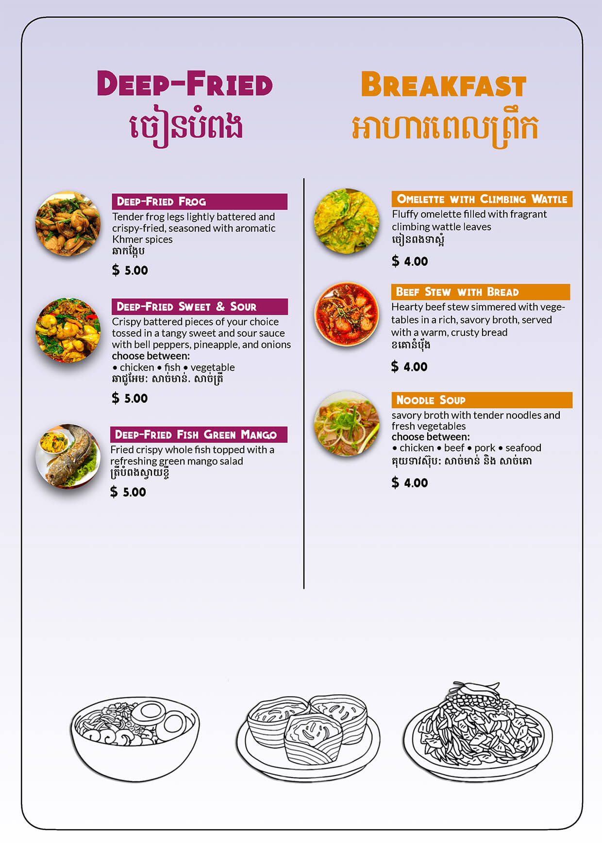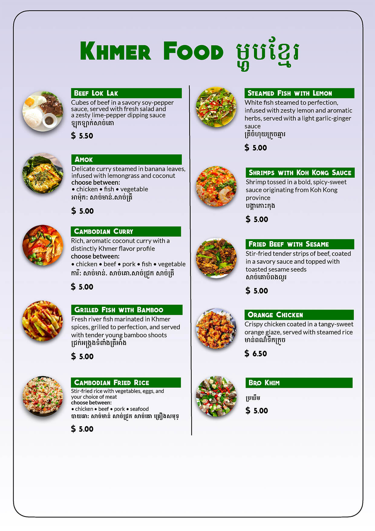 Indulge in a diverse array of freshly prepared Western and Khmer delicacies at our restaurant,